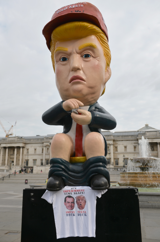 For his own safety, we thought to put his overlong tie into the toilet itself. He’s tweeting of course, and his mouth moves to utter deathless quotes in his own voice …. His Make America Great Again cap is subtitled ‘Impeach Me’ — as if we needed a reminder.