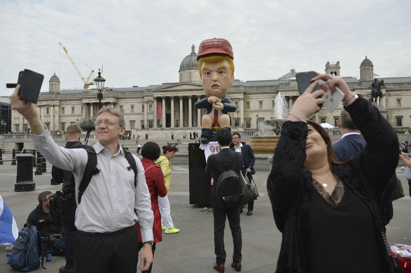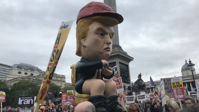 A 16ft talking robot of President Donald Trump nicknamed “Dump Trump” sitting on a gold toilet while tweeting appeared in Central London during the US president’s three-day state visit.