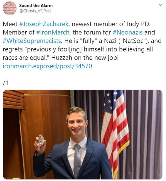 Joseph Zacharek, a former Indiana cop, was sacked by the Lafayette Police Department after he was accused of making discriminatory comments and sharing racist posts in a Neo-Nazi forum called the Iron March.