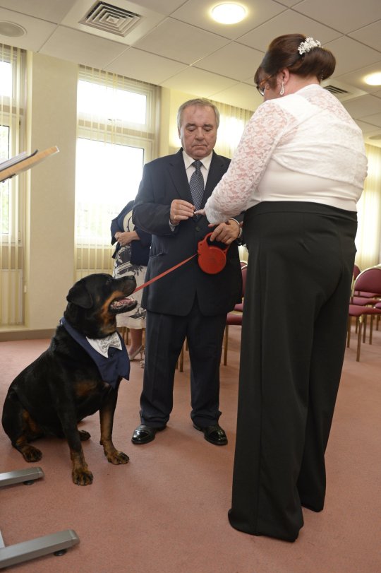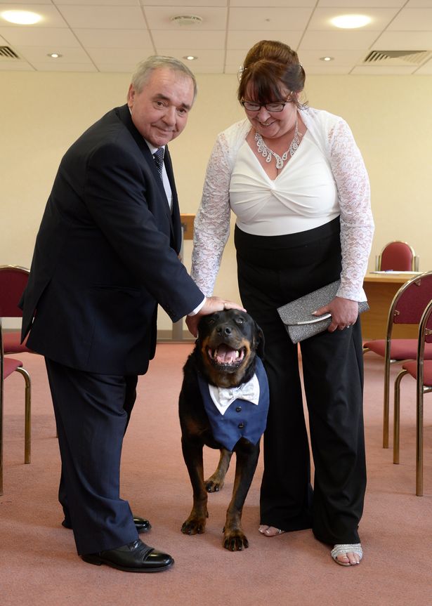 Wearing a mini tuxedo, Jack, a former guard dog, acted as best man when Christopher married Margaret Allison in a civil ceremony after meeting with her at a dog rescue centre.