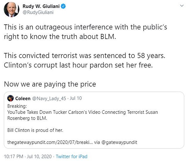 Giuliani said on the show: “Susan Rosenberg, who handles their finances is a convicted terrorist who was involved with the Black Panthers who used to slaughter police officers.