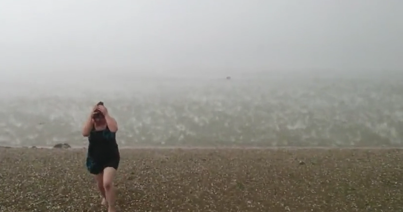 A sunbather has captured the transition of the weather dropping from 41-degree heat to hail storm.
