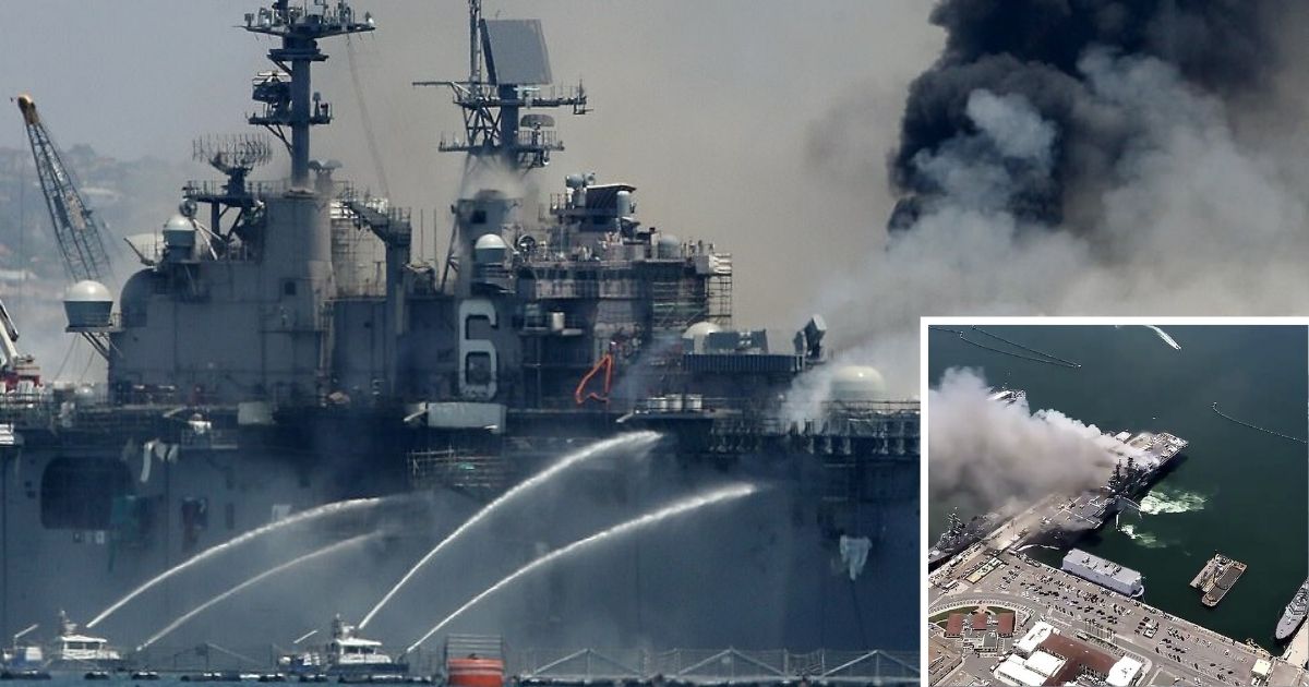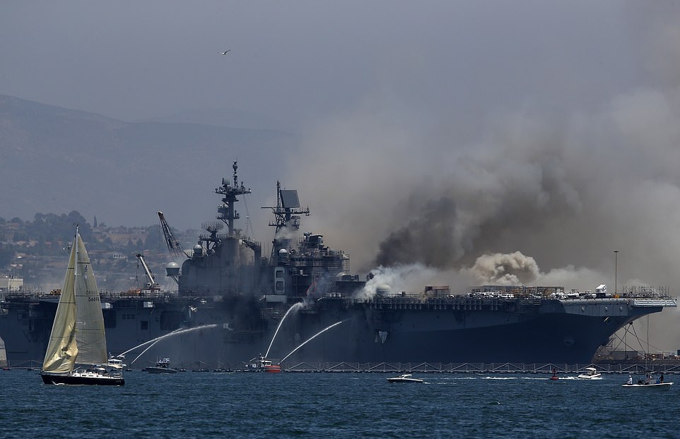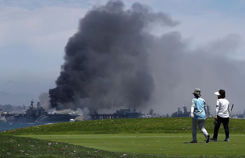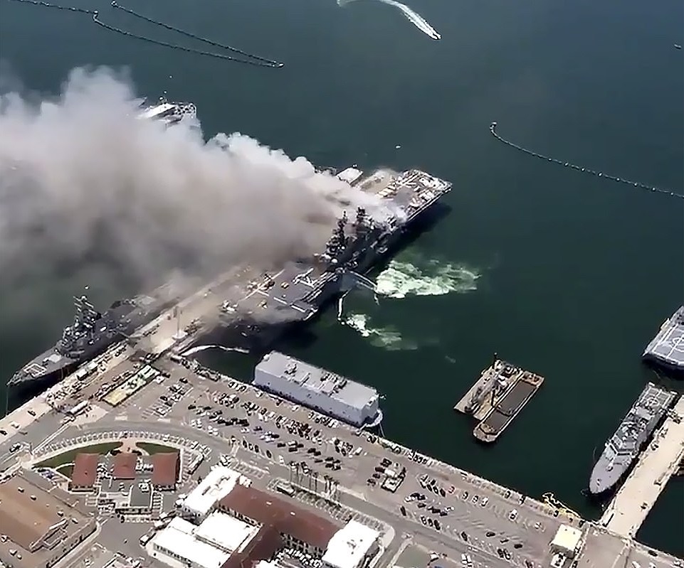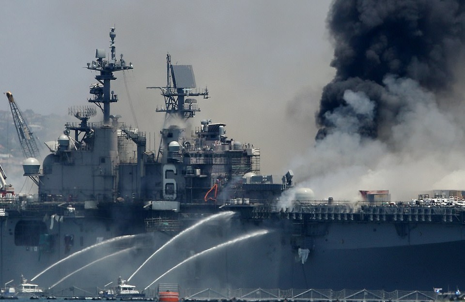 The incident occurred at Naval Base San Diego where USS Bonhomme Richard (LHD 6) was engulfed in flames following an explosion aboard the ship during routine maintenance.