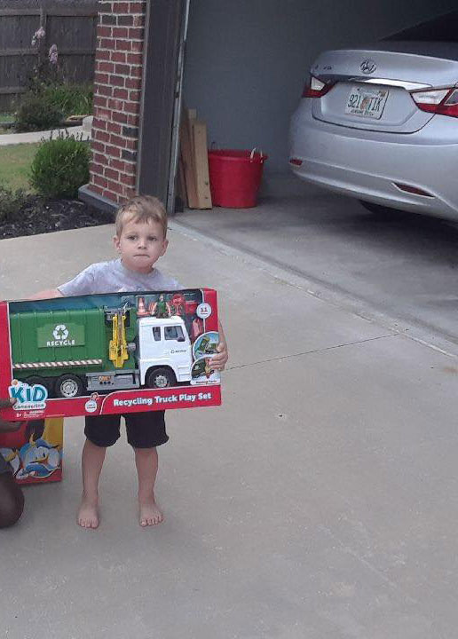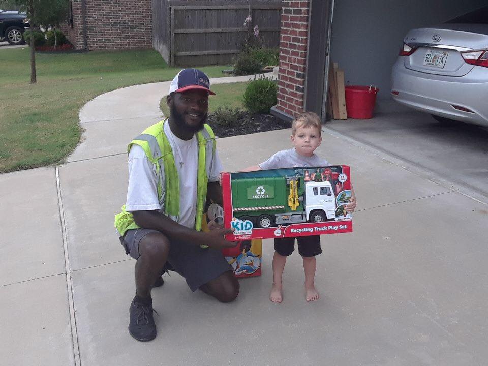 The City of Jenks shared a picture of a young boy with Aaron Mitchell, an employee with American Waste Control holding the gift.