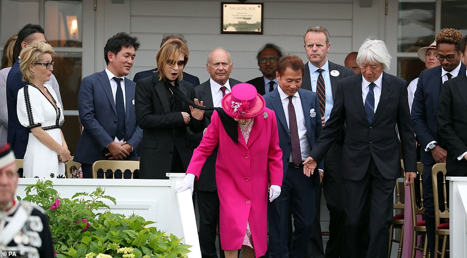 The musician is the leader of rock group X Japan, and he also appeared taken aback and was open-mouthed, while the Queen carried on, as usual, to make a presentation at the Royal Windsor Cup.