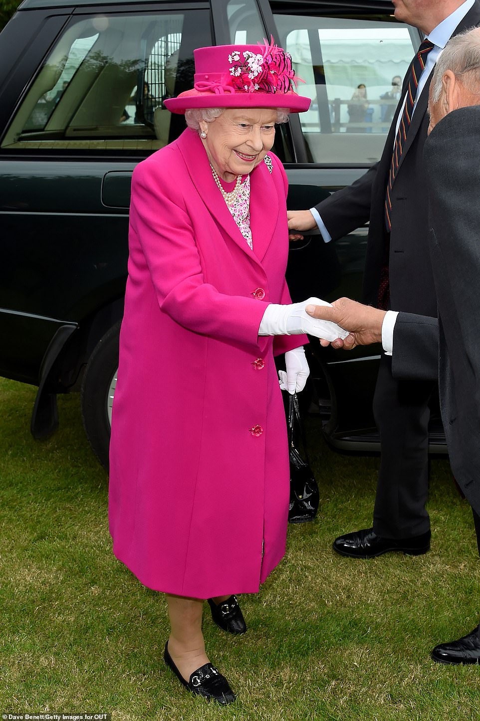 The Queen wore a bright pink dress and she accessorized with a matching hat which was decorated with flowers, a pearl necklace, and earrings as well as a silver brooch to complete her sophisticated look. To finish her ensemble the Queen added a pair of classic white gloves and her trademark black handbag.