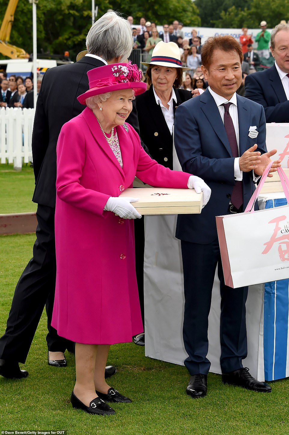 Her Majesty, 93, presents the trophy to the winning team at the end of the event at the Guards Polo Club, Windsor Great Park.