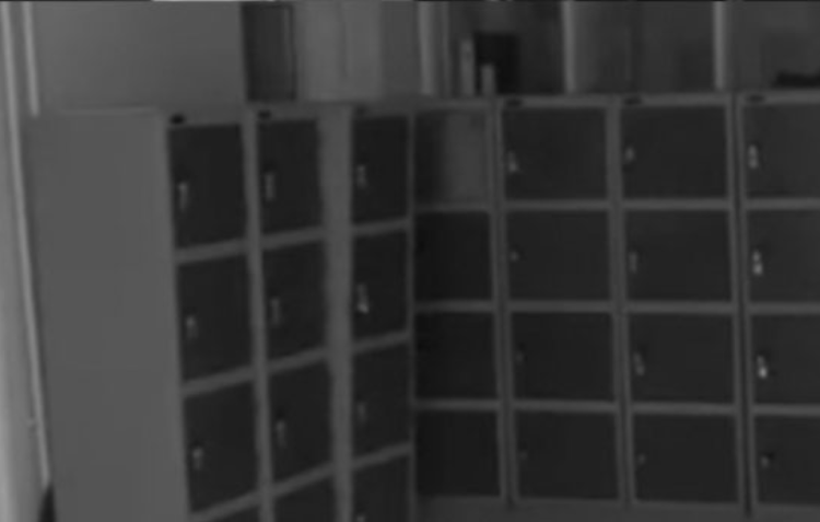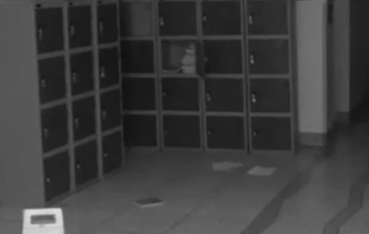 The paranormal activity starts when a door at the end of the corridor is seen to be opening and slamming shut with a loud bang. A few seconds later, some lockers can be seen violently shaking.