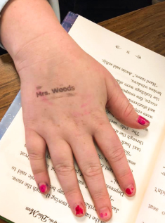 Ms. Woods has a stamp in school that she uses to stamp the books. But this time she had a different idea.