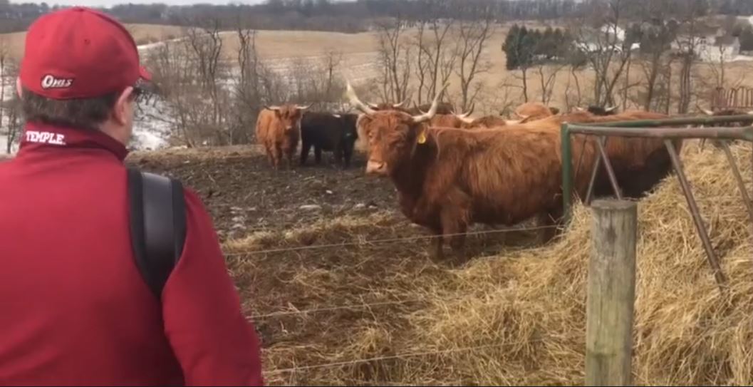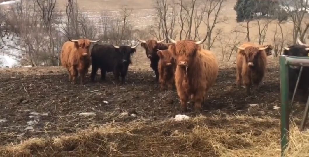 This herd of Scottish Highland cattle cannot stop listening to the music that is being played around them. As soon as the music starts playing, they come running towards it.