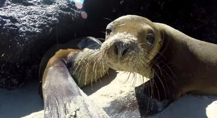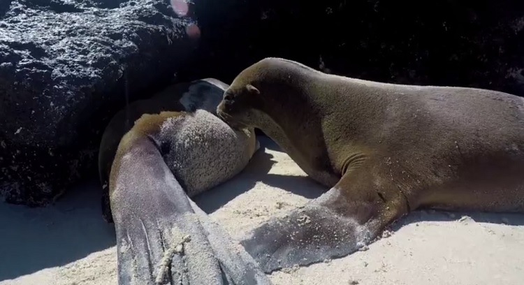 And so it happened that this tourist observed a sea lion pup happily nursing as its mother was lying back on the sand while shaded by the rock formation. The tourist comes closer in order to get a clearer view and at that point, the pup’s curiosity took over and it stopped nursing in order to approach the camera.