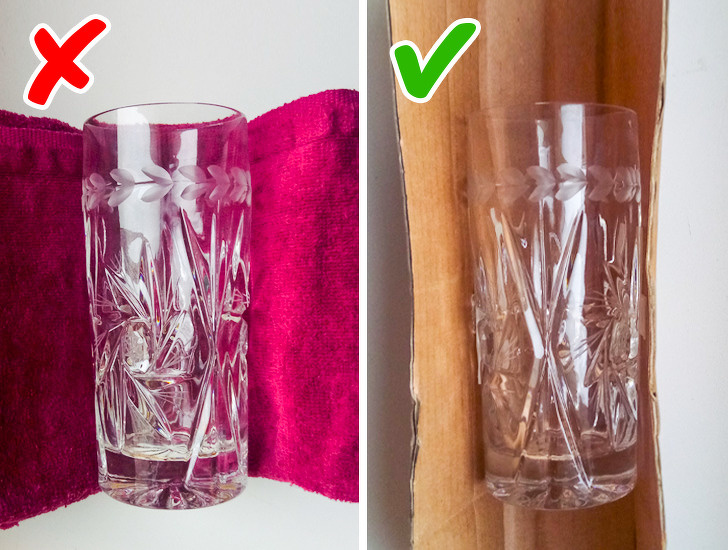 Always wrap glass objects in cardboard instead of cloth, you can use an old shoebox. Unlike soft towels, the thick carton will protect the fragile item better if the bag is dropped or placed under something heavy.