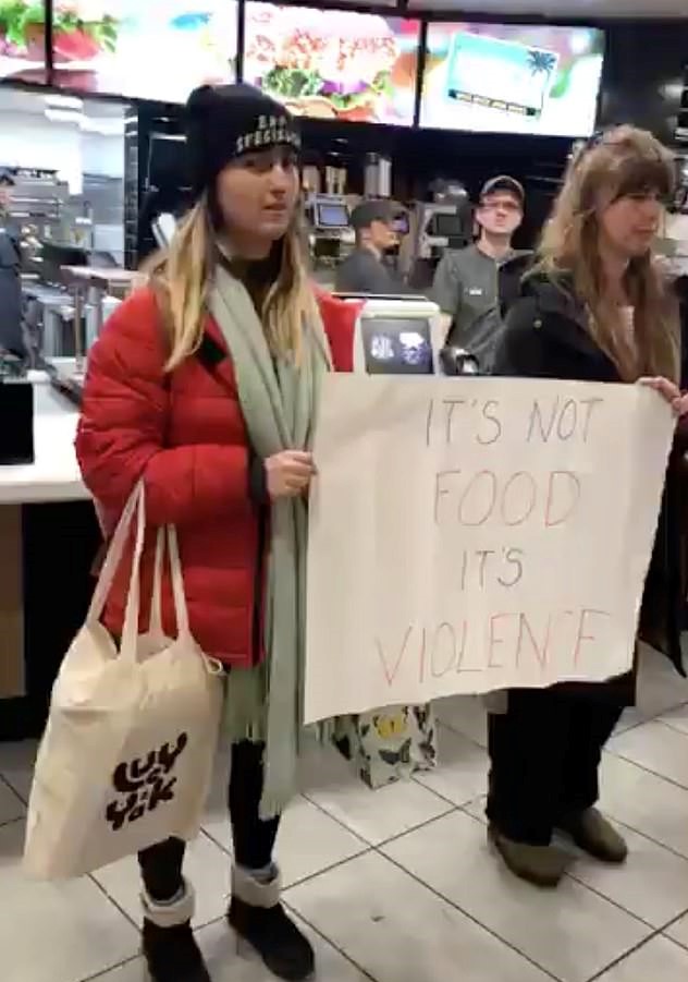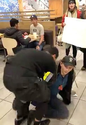 A security guard was caught on camera dragging vegan activists out of a McDonald’s after they staged a protest at the branch.