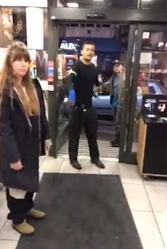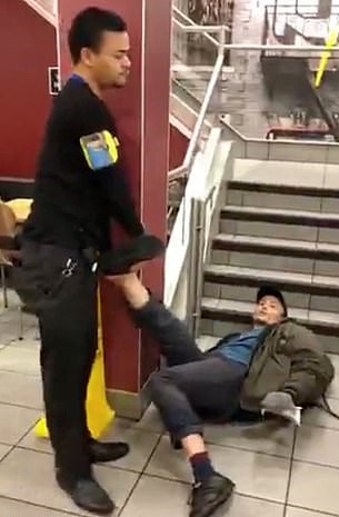 In the footage posted on social media, the security guard was seen pulling on a man’s foot before finally making him stand up and pushing him through the front door.