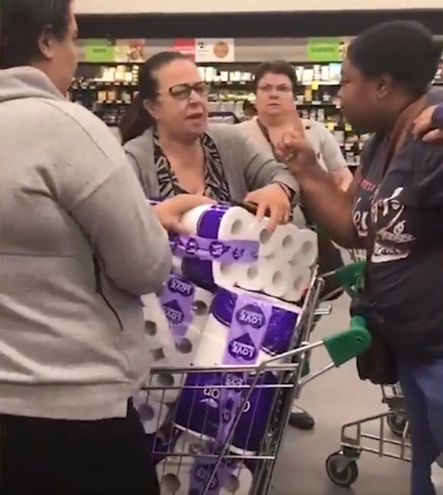 “I just want one packet,” one of the women said while the two women who had their shopping cart filled with toilet paper responded by saying: “No, not one packet.”
