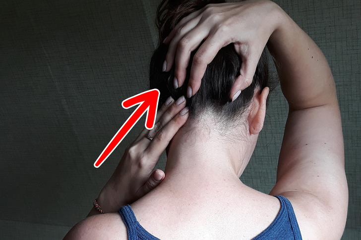 Put your left hand on the neck muscle behind your left ear, as shown in the picture above. Apply some gentle pressure onto the area with your fingers. Slowly turn your head to the right while applying the pressure. Don’t move your fingers, and that it’s just your head that is moving. Repeat on the other side.