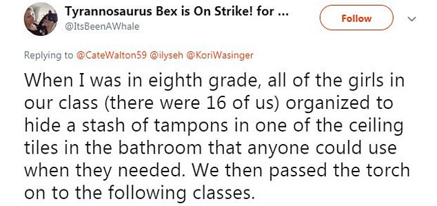 Another woman shared the point of view of the principal of her daughter’s school, saying: “My daughter went to a small, private Catholic school for a time (we’re not Catholic) and when it was suggested that a small cabinet be installed in the women’s restroom for period products, the head master vetoed it because, ‘The younger students might have questions.’”