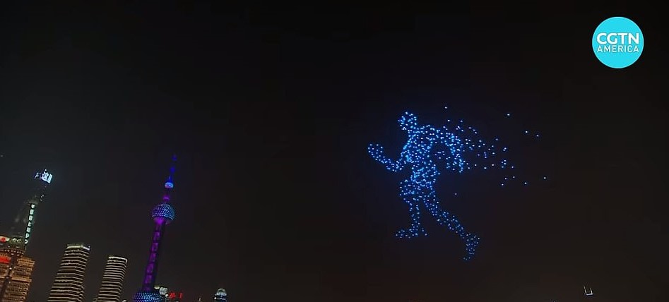 In addition to the display of conventional patterns and texts, the drones also formed what appeared to be a giant person running through the sky and signifying “huge changes and glorious achievements Shanghai has made in the past 40 years of reform and opening up.”