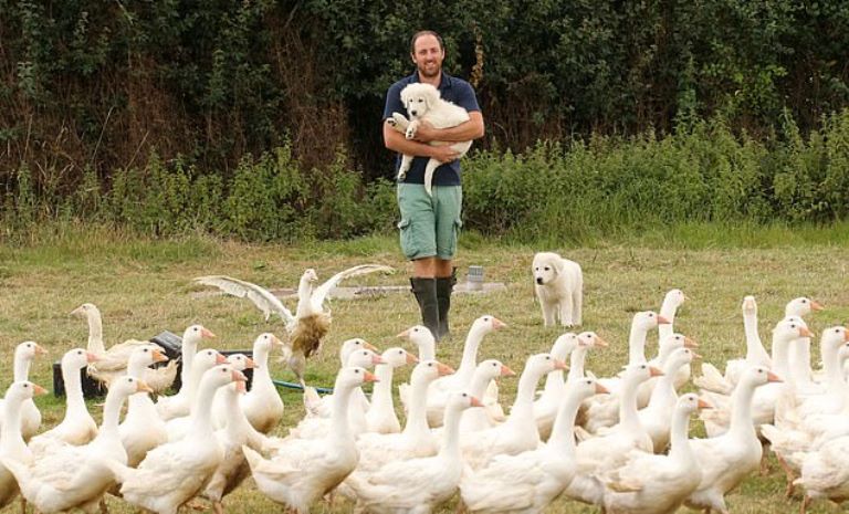 31-year-old Ollie White, a Somerset farmer, has recruited adorable companions to guard his chickens and geese.