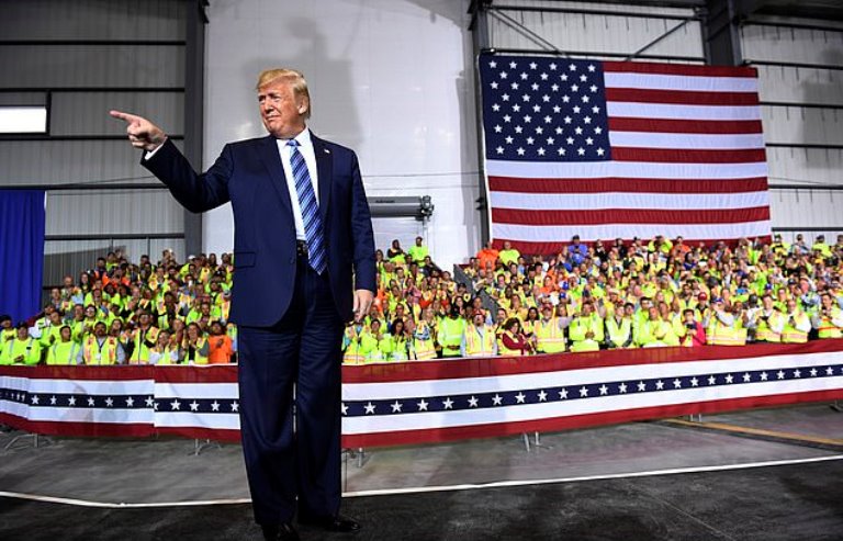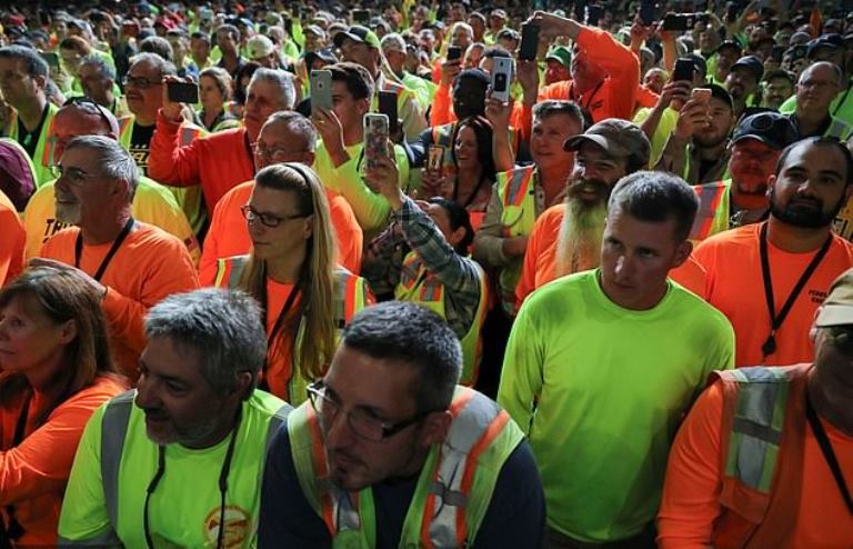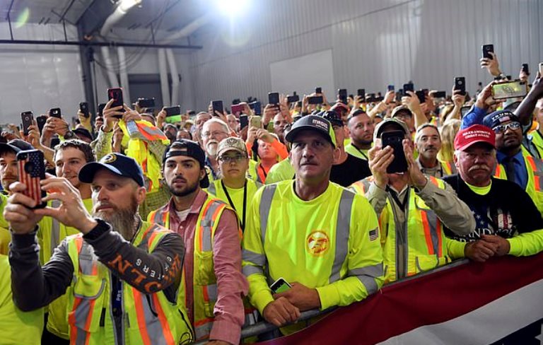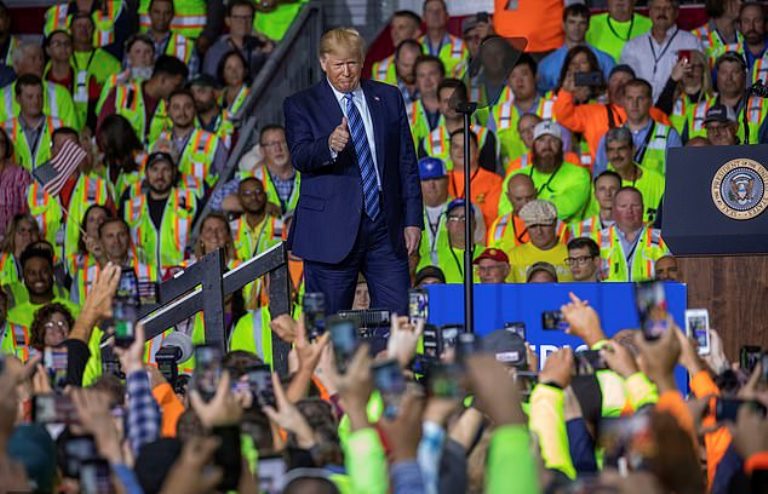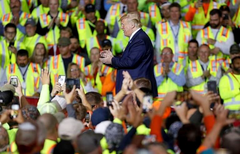 Surrounded by cheering employees in hi-vis vests, Trump said while on stage: “Factory floors across this land are once more crackling with life.