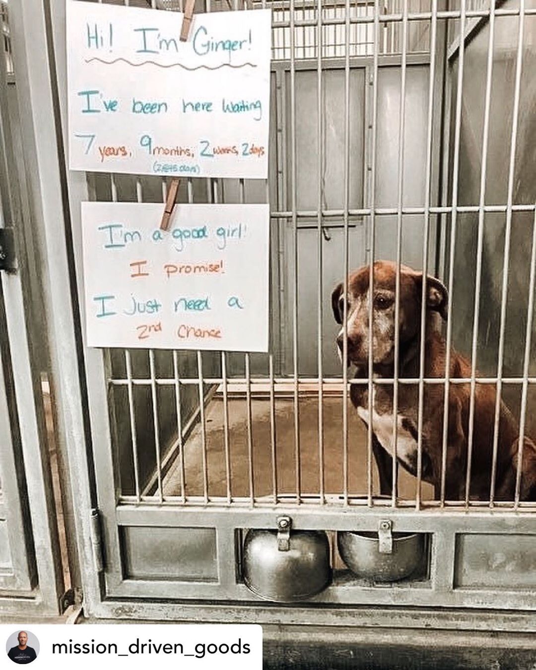 On Tuesday, the no-kill shelter shared a photo of Ginger at her kennel to social media with a sign that read, “Hi! I’m Ginger! I’ve been here waiting 7 years, 9 months, 2 weeks, 2 days. I’m a good girl! I promise! I just need a 2nd chance!”