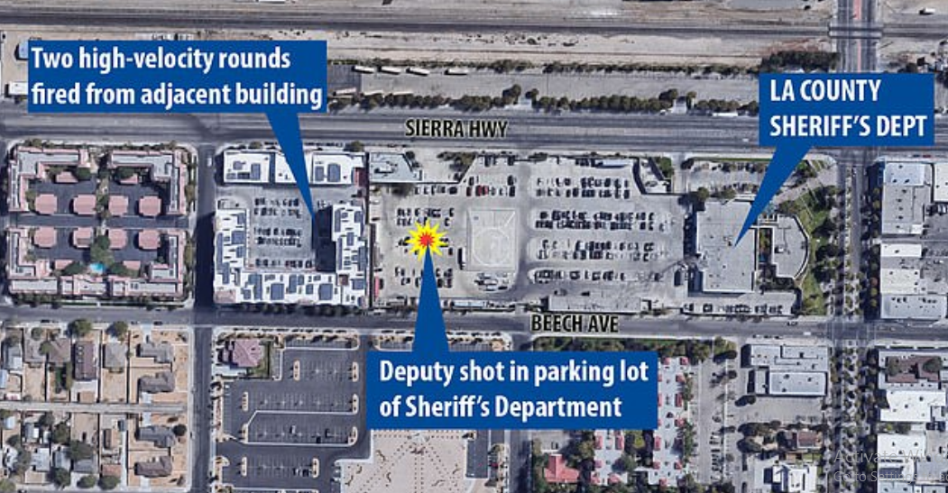 This is what happened when a Sherriff of Los Angeles County Sheriff’s Office was coming out to the parking lot of the office and got shot in the shoulder.