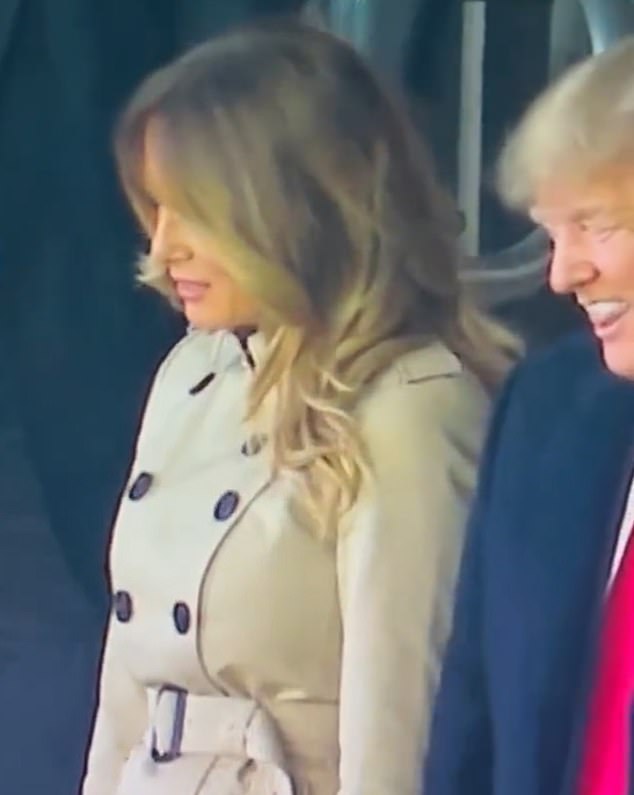 While everything appeared to be going well, a recent shot of the former first lady caught her smile fading away as her husband continued to point and wave towards the crowd of spectators who cheered the duo along after they appeared at the window.