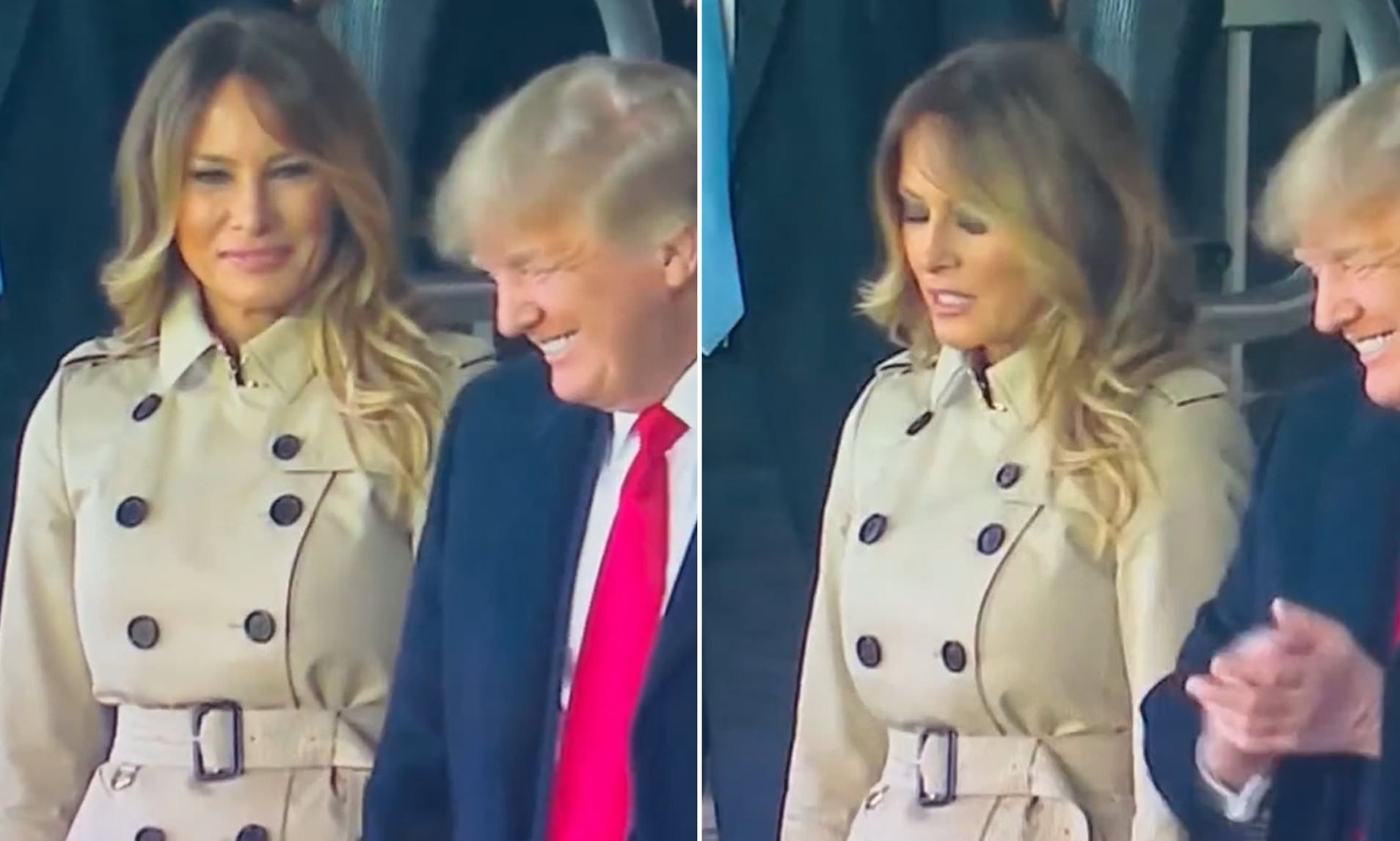 Both Melania and Donald entered the arena at the Braves game, holding hands and beaming with wide smiles. But all of a sudden, Melania’s expressions changed into stone cold, with many experts guessing the reason why.