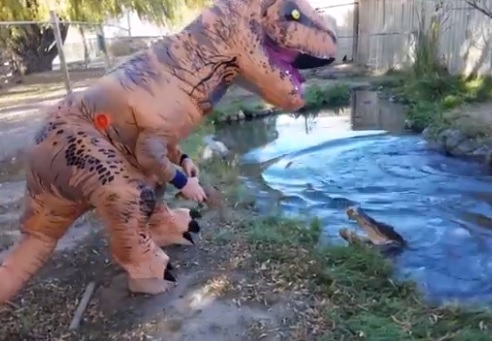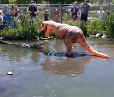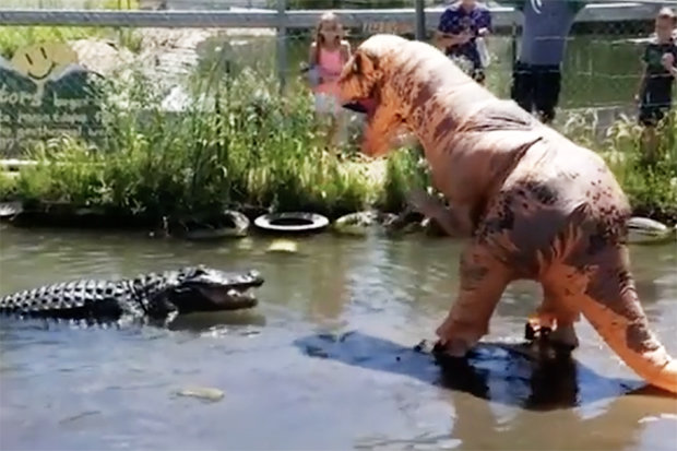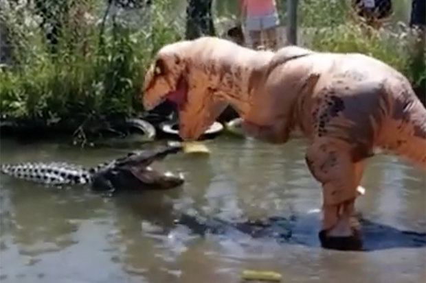In a bizarre confrontation, a man dressed in a T-Rex costume teased a fully grown alligator with its dinner during a feeding session.