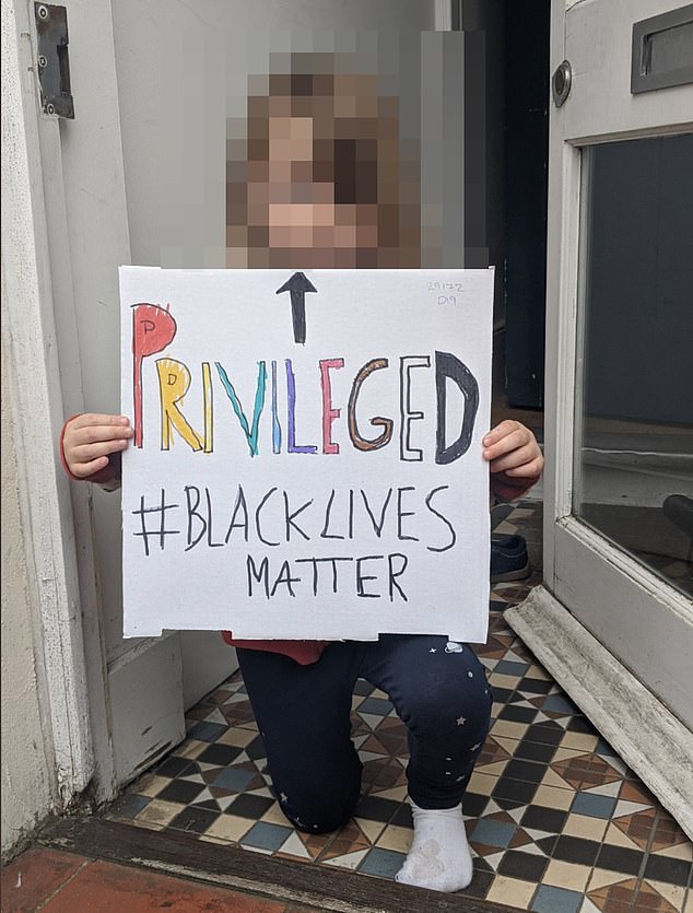 A British mother has been under fire by social media users after she uploaded a picture of her young daughter kneeling down while holding up a sign that read “Privileged” with an arrow that points up at her along with the hashtag #BlackLivesMatter.