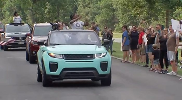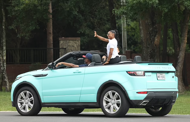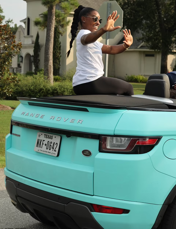 Despite the controversy over her decision to pull out from five event finals over issues with her mental health, she put her problems behind her as she enjoyed a parade from her Range Rover convertible.