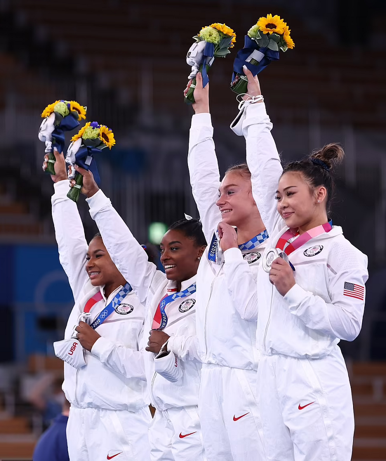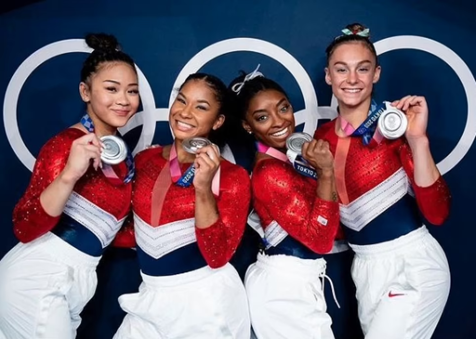 Biles shared a photo of her and teammates Suni Lee, Jordan Chiles, and Grace McCallum on Instagram showing off their silver medals after they won second.