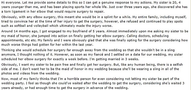 The anonymous woman, 24, from the US, took to Reddit and explained that her 20-year-old sister tore a ligament in her elbow during sports activity – and decided to go for a surgery to get it fixed just one week before the wedding.