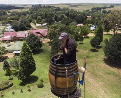 As for the bodily functions, he relies on the bucket and his ground crew below, and the nearby restaurant has been supporting him with good food.