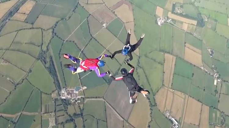 But a trio of skydivers decided to take things to the next level by performing a jump that involved hold each other’s ankles to form a rolling tube in the air.