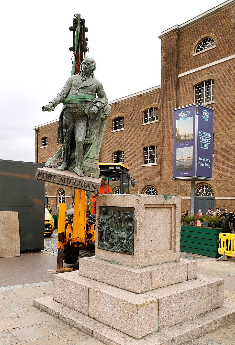 The monument depicting Robert Milligan, a slave dealer infamous for keeping hundreds of slaves at his sugar plantation, stood proud on the docks of West India Quay in London since it was sculpted in 1809 following Milligan’s death.