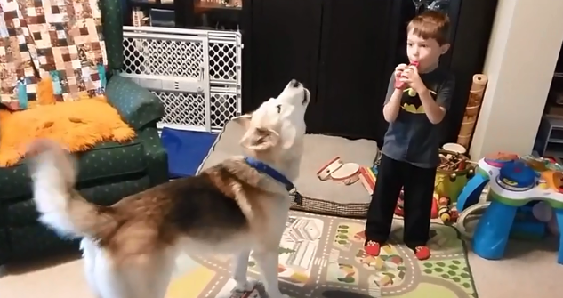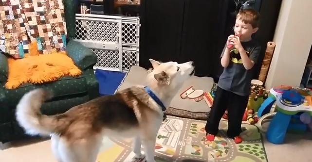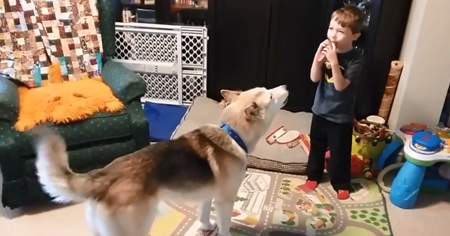 The small boy takes the pleasure in making new type of sounds for his small pup. Little did the boy know that husky was expecting finesse sound?
