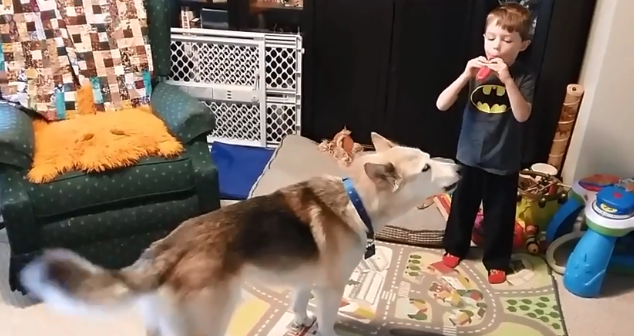 Husky’s ears started to hurt when the small boy started to whistle. The small husky got a bit offended by the noise that was made by the small boy.
