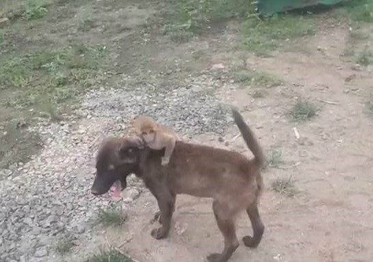 A smart and loving dog has gone viral after placing an abandoned baby monkey on its back before taking it to the police station.