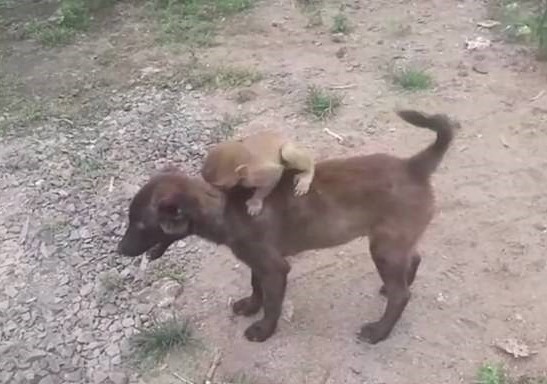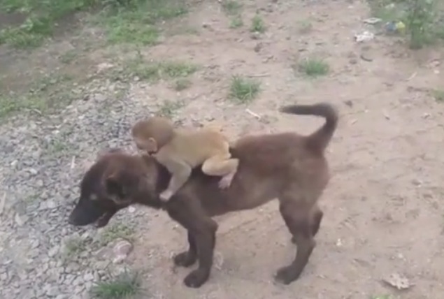 As if the dog in this story knew where to look for help, he loaded a tiny monkey on its back after discovering it all alone at the side of the lake.