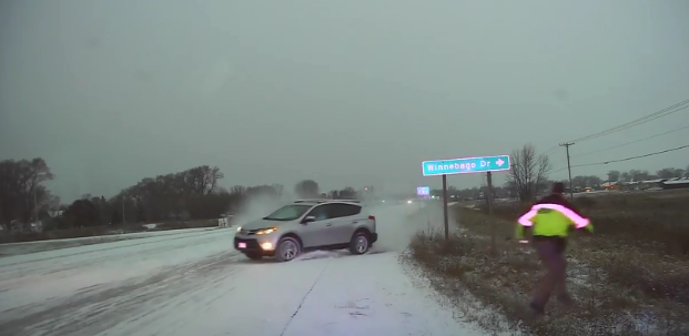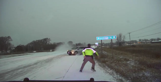 Watch a video about an officer saving his life as he jumps out of the way from an uncontrollable car.