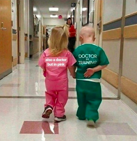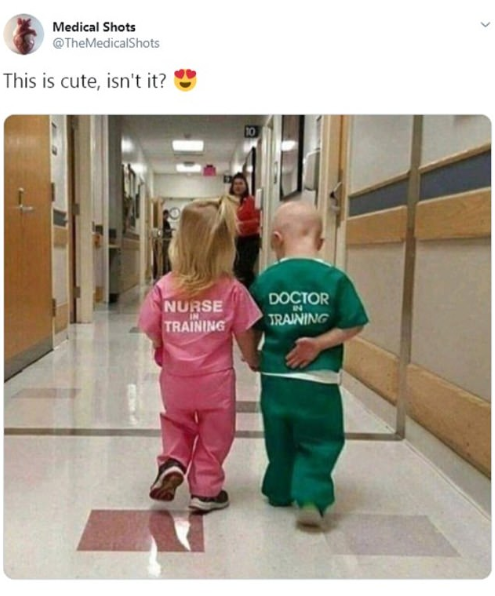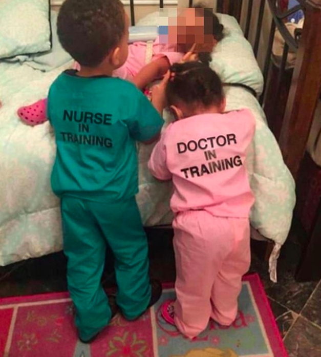 The picture that has been brought in the limelight features two kids, a girl wearing a pink scrub that read ‘nurse in training’ and the boy whose scrub is green has written ‘Doctor in training’ on his back.