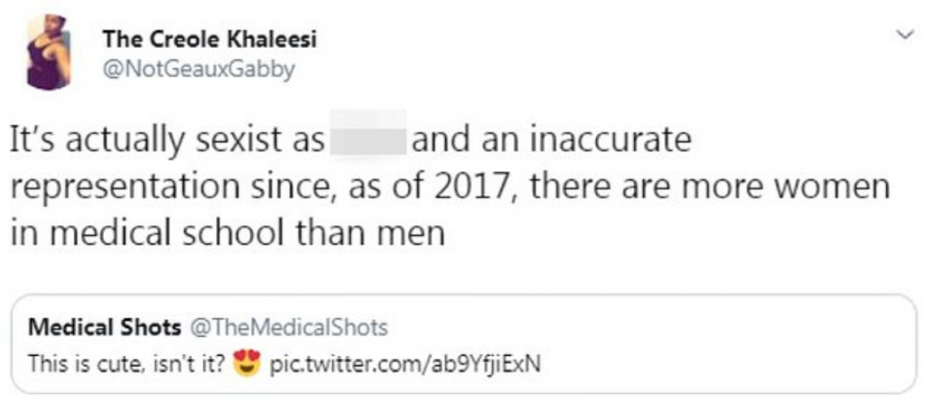 Why can’t the female be the doctor and male the nurse? Or why they both couldn’t have been doctors? This was just a sexist picture that is giving out a dangerous message.”