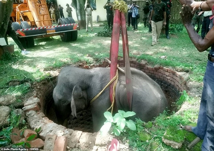 A young elephant who fell into a 20-foot well deep in the jungles of India was saved from a sad fate thanks to the efforts of kind soldiers who heard its cries for help.