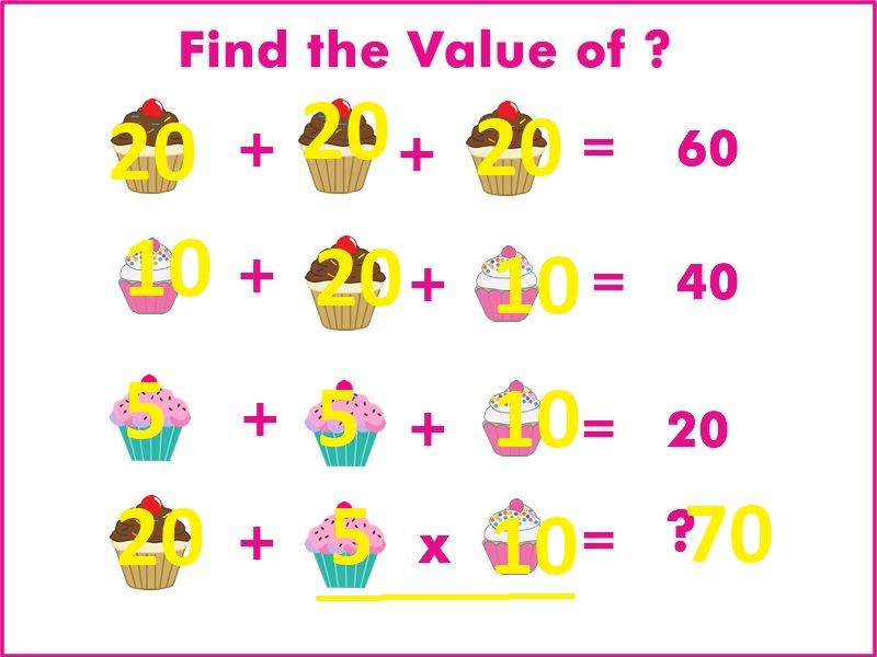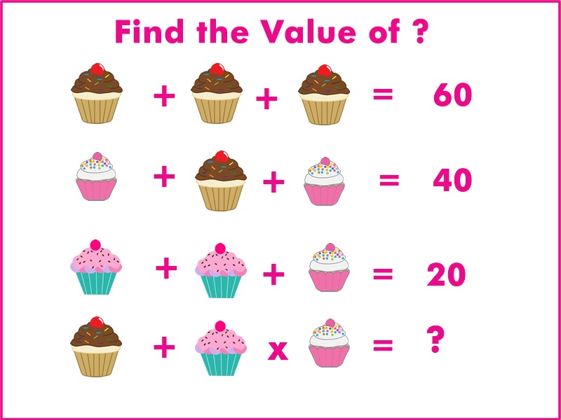 In this math puzzle, you can see a series of cupcakes spread across four lines or four equations. Your task is to find out what number should replace the question mark at the bottom.