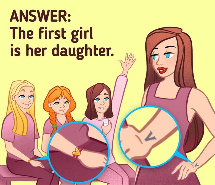 Have you figured it out yet? The girl closest to the mother looks exactly like her – but she is not her daughter. Neither is the girl with orange hair. How do we know this?