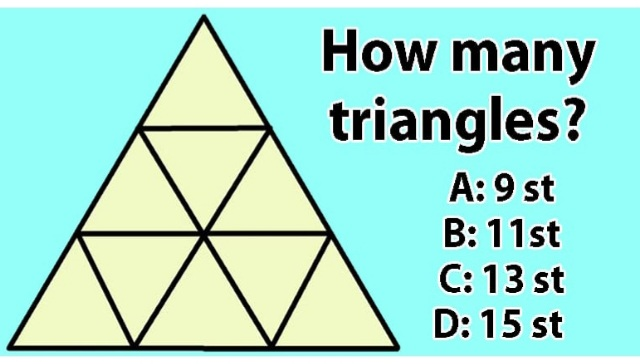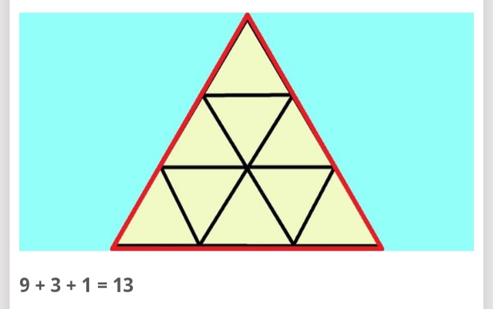 To reach the solution, you had to take into consideration the big, medium, and small triangles. That means 9 small, 3 medium, and then one large triangle.