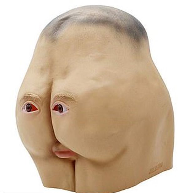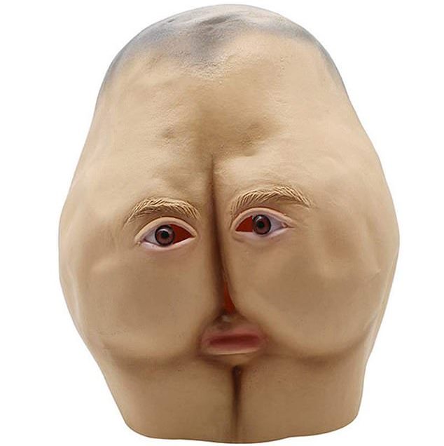 Sold by the company YYF for $20.89, the mask is in the shape of buttocks, cut off at the upper legs and lower back. There are two eyes on each side and a crack in the middle.