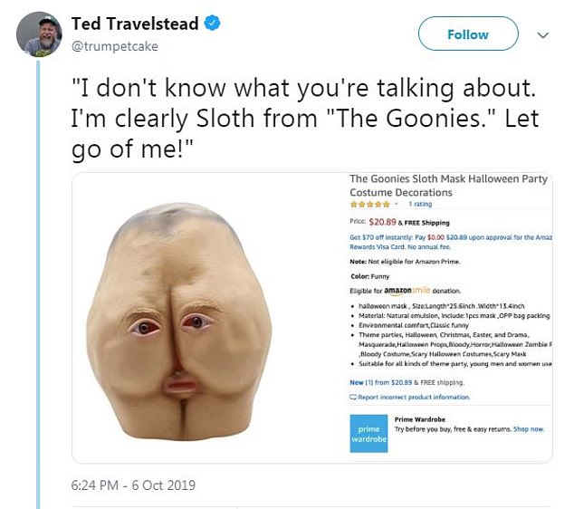 The hilarious product on Amazon describes it as a “Latex Mask Rubber Creepy Ugly Hip Head the Goonies Sloth Mask,’ Now, who wants to buy this ‘hip head’ plus ‘sloth’?
