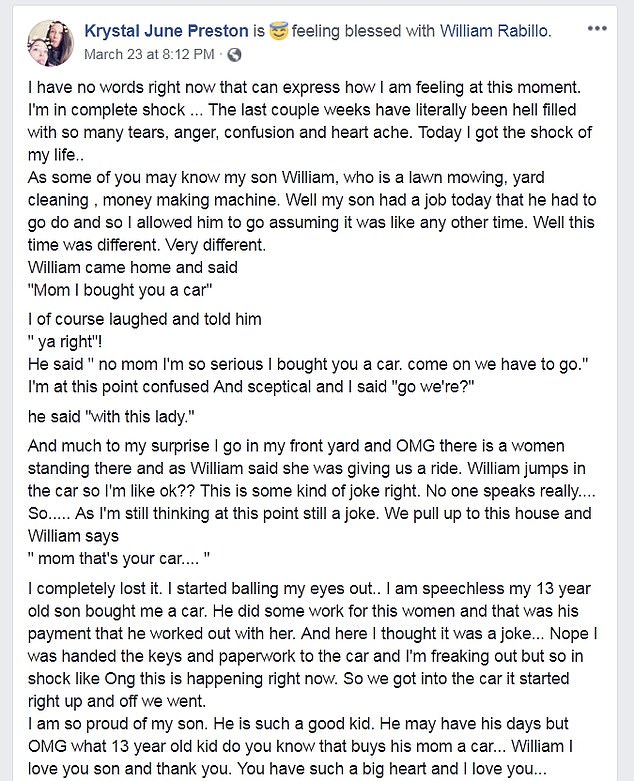 William Rabillo, 13, surprised his mom, Krystal Preston, with a 1999 White Chevrolet Metro during what she has called ‘her low point,’ after getting inspiration from videos on the internet.